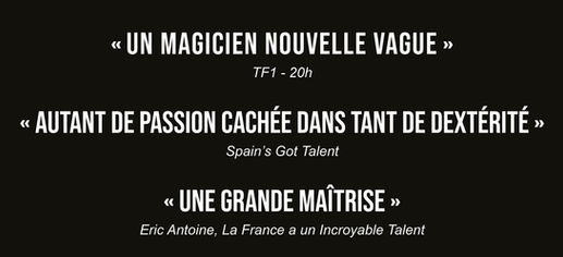 Après avoir joué MAGICIEN(s) TOUT EST ÉCRIT au Théâtre Hébertot et aux Folies Bergère, remporté le titre de « Meilleur Spectacle de Magie » avec MAGIC BOX au Splendid et au Théâtre de la Renaissance, sans oublier l’émission MagicKids et ses nombreuses apparitions sur les plateaux Incroyable Talent à travers le monde, aujourd’hui…